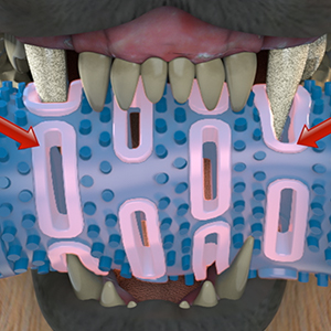 Chewbrush works three ways to keep your dog's teeth clean. First. as your dog chews. the interior core of bristles gently brushes their teeth. As the teeth enter the strategically positioned openings. Chewbrush scrapes away tartar and plaque buildup. Then the little rubber nubs on Chewbrush's exterior gently massage gums to improve circulation.